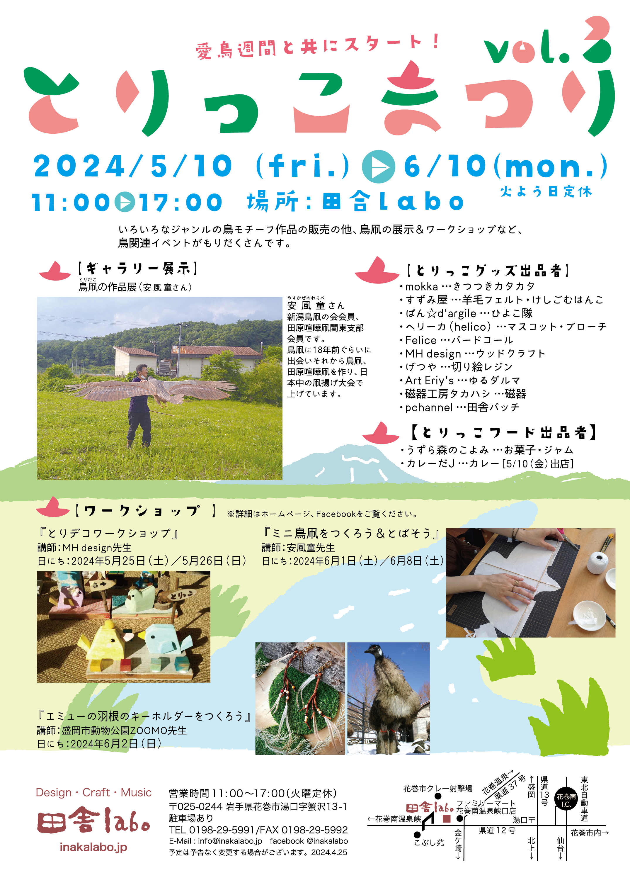 いろいろなジャンルの鳥モチーフ作品の販売、鳥凧の展示&ワークショップなど鳥関連イベント盛り沢山!